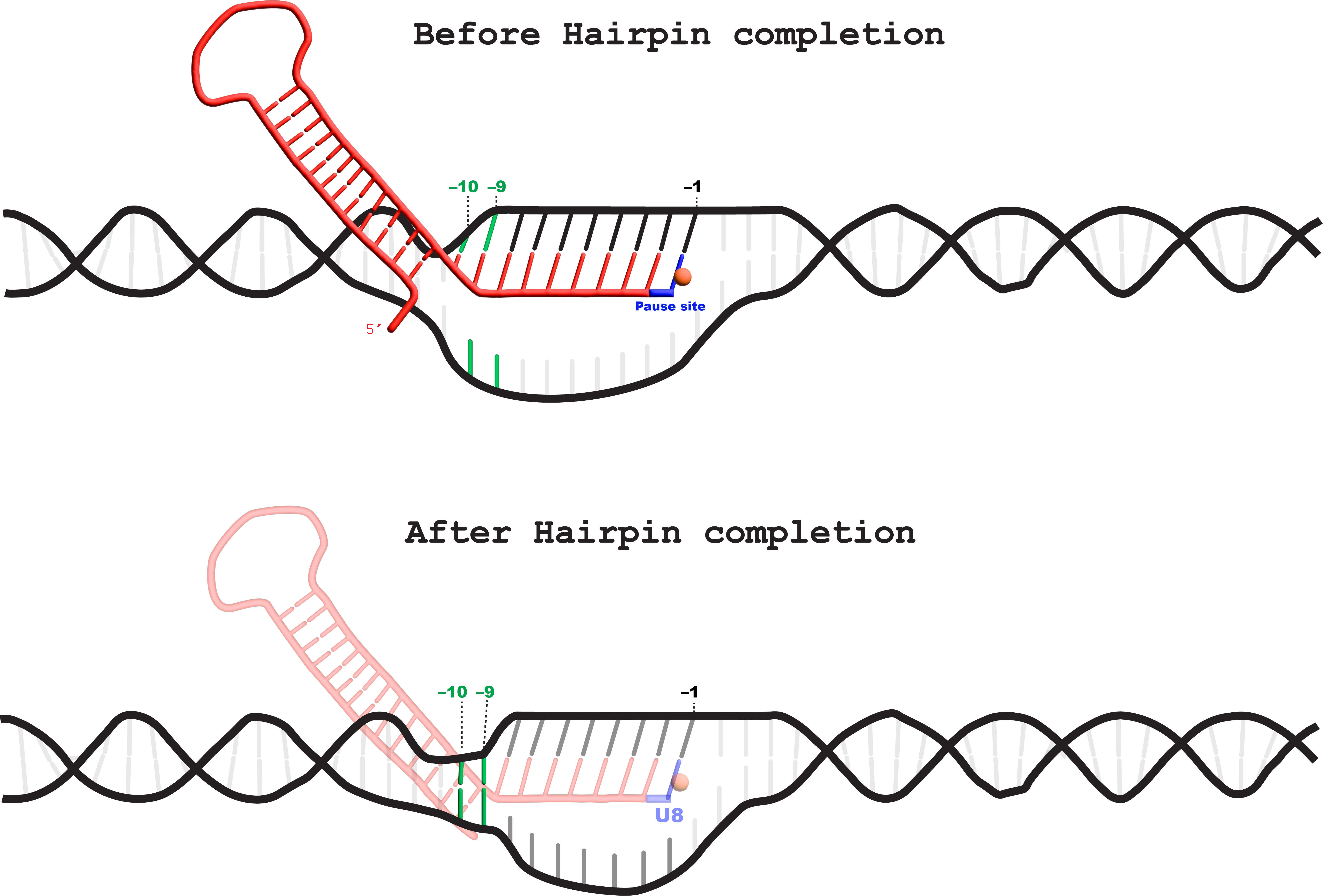 While in elemental paused state, RNA polymerase pausing can be further stabilized by formation of a pause hairpin inside