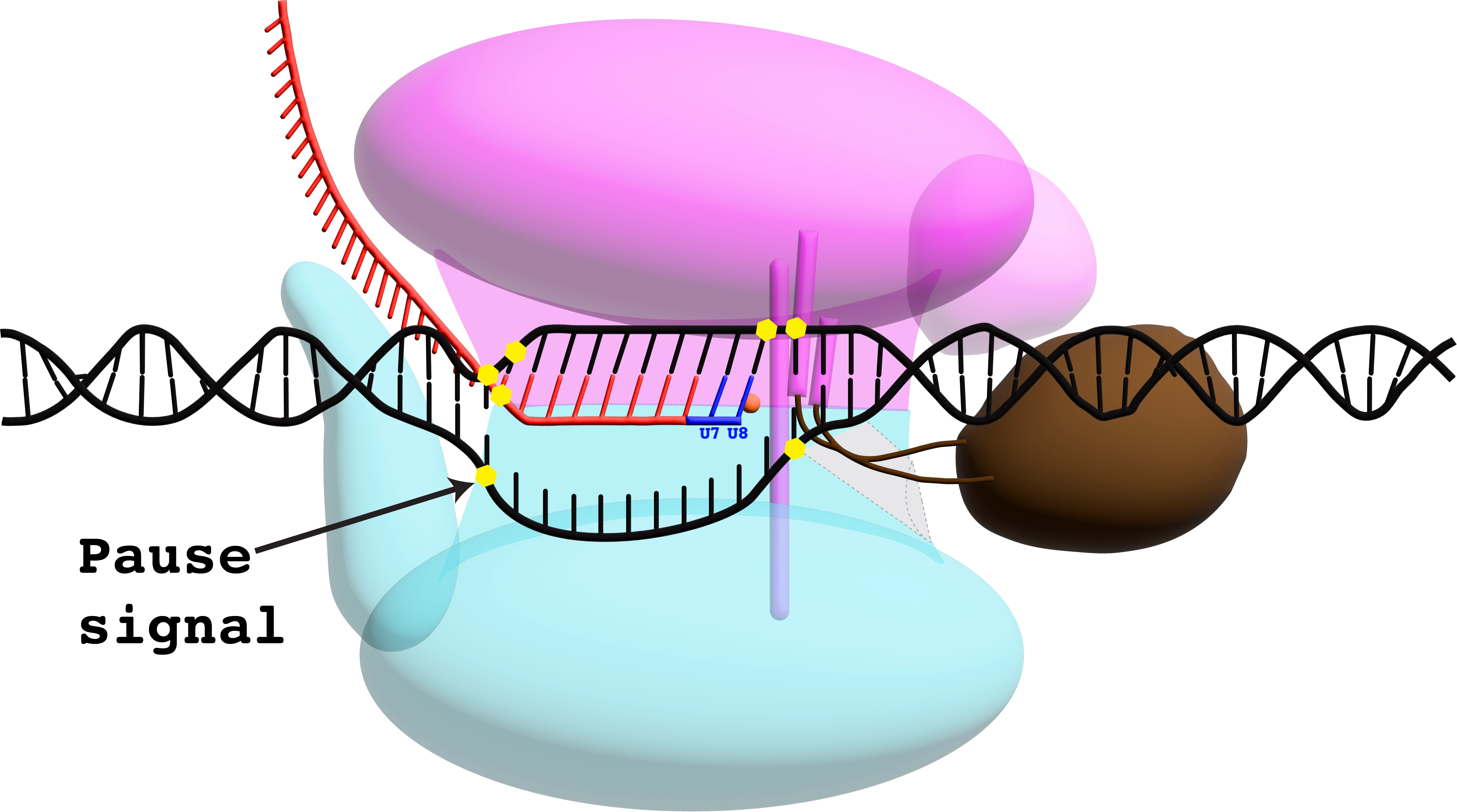 During transcription elongation, RNA polymerase gets a signal to slow down (pause momentarily) at U7 and U8 of the uracil tract.
