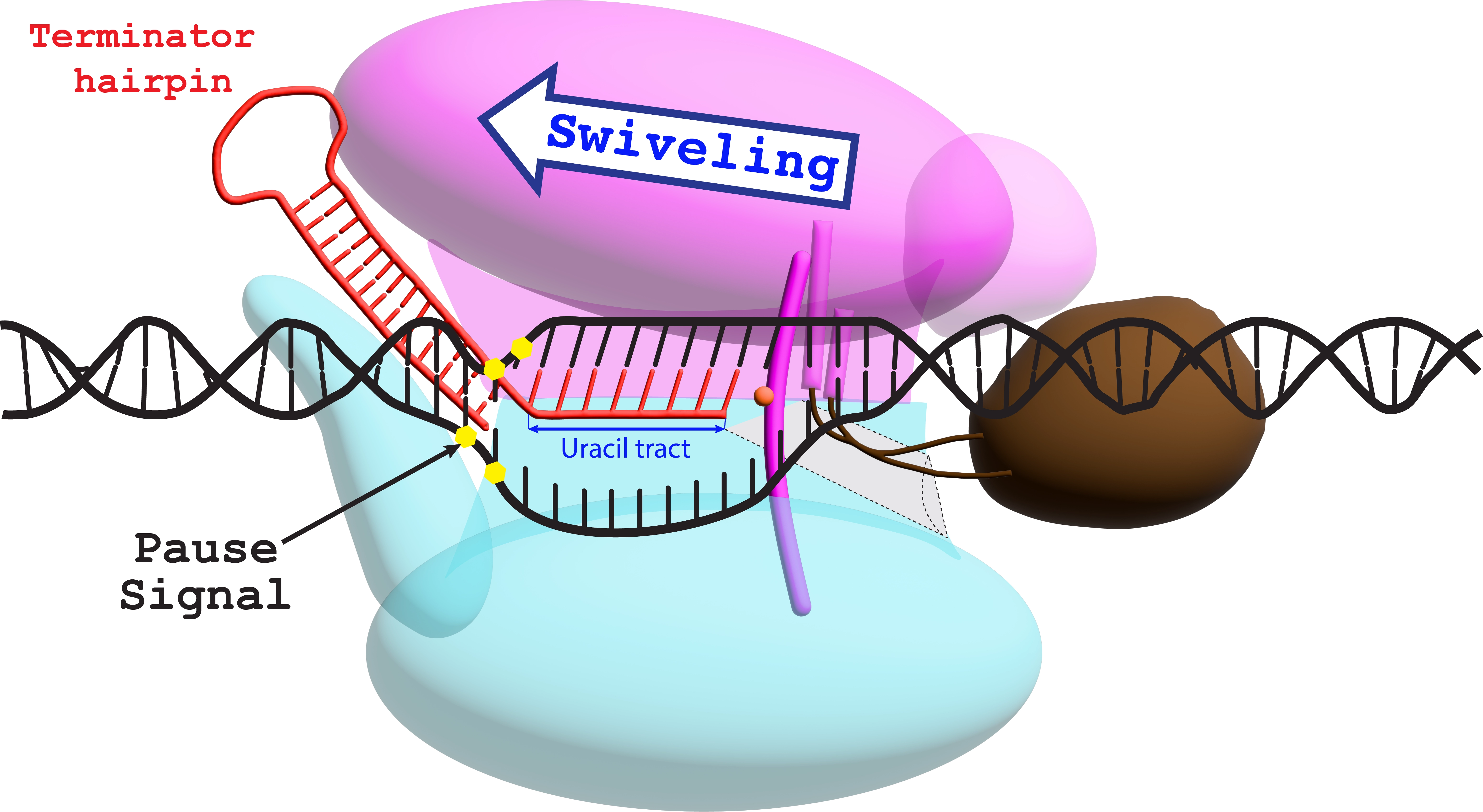 Once RNA polymerase is paused, the exit channel widens to accomodate the nucleating terminator hairpin. This causes RNAP to swivel.